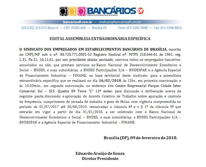 O Sindicato realiza na sexta-feira (16), às 15h, assembleia extraordinária específica dos funcionários do Banco Nacional de Desenvolvimento Econômico e Social (BNDES) e suas subsidiárias para discussão e aprovação do Acordo Coletivo de Trabalho sobre apuração e controle de frequência, cumprimento de jornada de trabalho e gozo de férias.