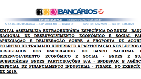EDITAL ASSEMBLEIA EXTRAORDINÁRIA ESPECÍFICA DO BNDES - BANCO NACIONAL DE DESENVOLVIMENTO ECONÔMICO E SOCIAL PARA APRECIAÇÃO E DELIBERAÇÃO SOBRE A PROPOSTA DE ACORDO COLETIVO DE TRABALHO REFERENTE À PARTICIPAÇÃO NOS LUCROS OU RESULTADOS DOS EMPREGADOS DO BANCO NACIONAL DE DESENVOLVIMENTO ECONÔMICO E SOCIAL - BNDES E SUAS SUBSIDIÁRIAS BNDES PARTICIPAÇÕES S/A - BNDESPAR E AGÊNCIA ESPECIAL DE FINANCIAMENTO INDUSTRIAL - FINAME, NO EXERCÍCIO DE 2019.