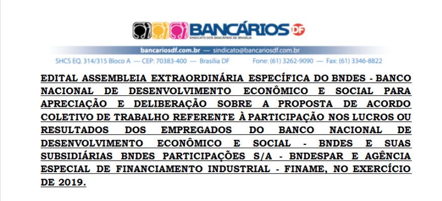 O Sindicato dos Empregados em Estabelecimentos Bancários de Brasília, inscrito no CNPJ/MF sob o nº 00.720.771/0001-53, Registro sindical nº. 218.646/61, por seu presidente abaixo assinado, convoca todos os empregados bancários, associados ou não, que prestam serviços no Banco Nacional de Desenvolvimento Econômico e Social – BNDES, e suas subsidiárias, a BNDES Participações S/A - BNDESPAR e a Agência Especial de Financiamento Industrial - FINAME, na base territorial deste sindicato, para a assembleia extraordinária específica que se realizará no dia 25/10/2019, às 16h, em primeira convocação, ou às 16h30m, em segunda e última convocação, no SHCS - QUADRA 09 TORRE “C” EDIFÍCIO PARQUE CIDADE - BRASÍLIA-DF, para discussão e deliberação acerca da seguinte pauta: 1) Apreciação e deliberação sobre a proposta de Acordo Coletivo de Trabalho referente à Participação nos Lucros ou Resultados dos empregados do Banco Nacional de Desenvolvimento Econômico e Social - BNDES e suas subsidiárias BNDES Participações S/A - BNDESPAR e Agência Especial de Financiamento Industrial - FINAME, no exercício de 2019.