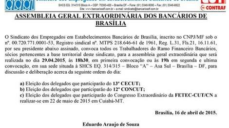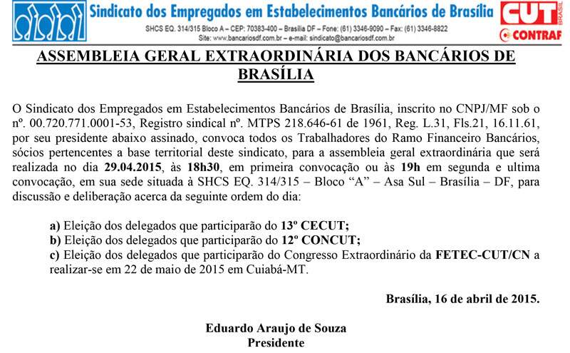 O Sindicato convoca as bancárias e bancários sindicalizados, de bancos públicos e privados, trabalhadores do ramo financeiro e cooperativários para participarem da assembleia geral que será realizada na quarta-feira (29) para eleger as delegadas e delegados que representarão Brasília no 13º Congresso Distrital da CUT (Cecut), no 12º Congresso Nacional da CUT (Concut) e no congresso extraordinário da Federação dos Trabalhadores em Empresas de Crédito do Centro Norte (Fetec-CUT/CN). Será às 18h30 em primeira convocação, e às 19h, em segunda e última convocação, na sede do Sindicato (SHCS EQ 314/315).