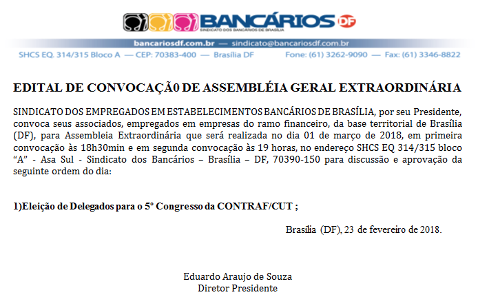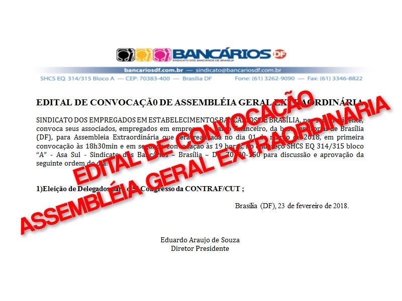 O Sindicato realiza na quinta-feira (1º), às 18h30, em primeira convocação, e às 19h, em segunda e última convocação, assembleia extraordinária dos associados e funcionários das empresas do ramo financeiro para eleição de delegados para o 5º Congresso da Contraf-CUT. A assembleia acontecerá na sede do Sindicato (EQS 314/1315 bloco A).