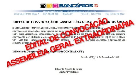 O Sindicato realiza na quinta-feira (1º), às 18h30, em primeira convocação, e às 19h, em segunda e última convocação, assembleia extraordinária dos associados e funcionários das empresas do ramo financeiro para eleição de delegados para o 5º Congresso da Contraf-CUT. A assembleia acontecerá na sede do Sindicato (EQS 314/1315 bloco A).
