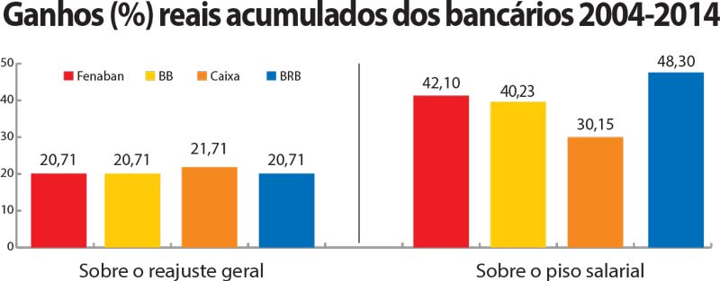 A proposta da Poupex vai ao encontro do que foi conquistado pela categoria bancária, que garantiu aumento real no piso pelo 11º ano consecutivo, de 2004 até 2014. O ganho real acumulado no piso dos últimos dez anos foi de 42,10%, de acordo com levantamento do Departamento Intersindical de Estatística e Estudos Socioeconômicos (Dieese).