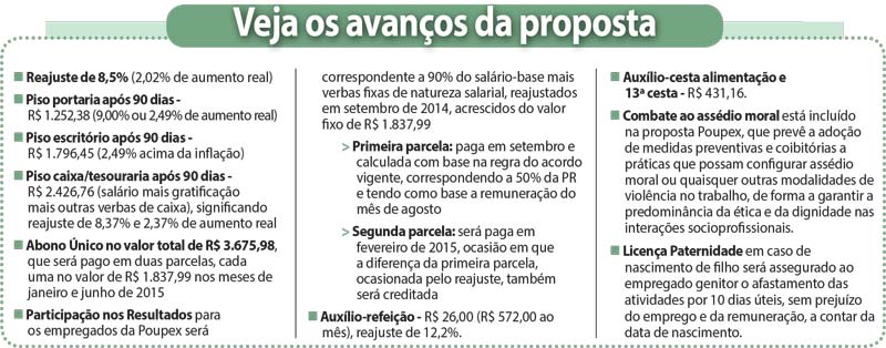 A Poupex também pagará Participação nos Resultados (PR) a todo empregado admitido até 31 de dezembro de 2013, correspondente a 90% do salário-base mais verbas fixas de natureza salarial reajustados em setembro deste ano, acrescidos do valor fixo de R$ 1.837,99.