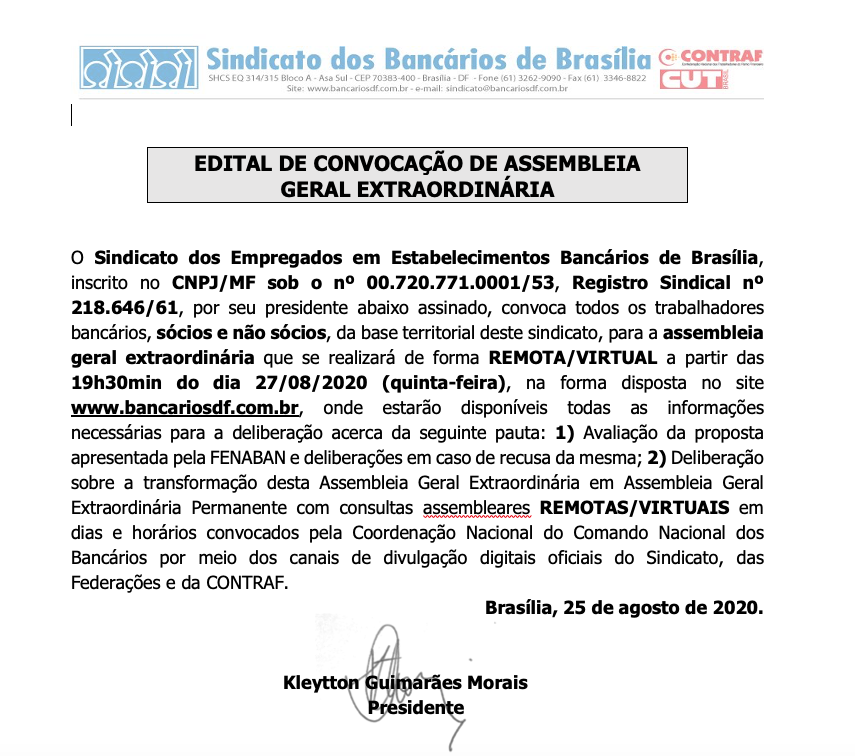 Mobilizar a categoria e organizar os próximos passos da Campanha Nacional 2020, de forma a potencializar o alcance das ações do Sindicato e pressionar os bancos a apresentarem uma proposta decente para as reivindicações dos bancários. Foi com esse objetivo que o Sindicato realizou nesta terça-feira (25) assembleia geral virtual da categoria, dentro do calendário de mobilização da Campanha definido pelo Comando Nacional dos Bancários.