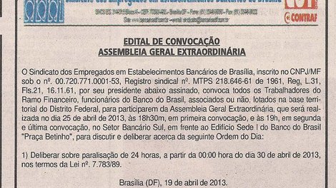 Os funcionários do Banco do Brasil estão convocados a participar de assembleia para deliberar sobre proposta de paralisação de 24 horas no dia 30 de abril. A assembleia será dia 25, às 19h, na Praça do Cebolão.