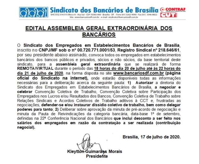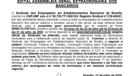 O Sindicato convoca os bancários e bancárias, de bancos públicos e privados, para participarem de assembleia geral remota que será realizada pelo período das 18h do dia 20 até às 22h do dia 21 de julho, para deliberar sobre a minuta de pré-acordo de negociação e a minuta da pauta de reivindicações da categoria bancária que serão definidas na 22ª Conferência Nacional dos Bancários.