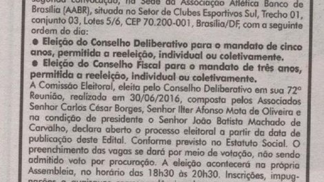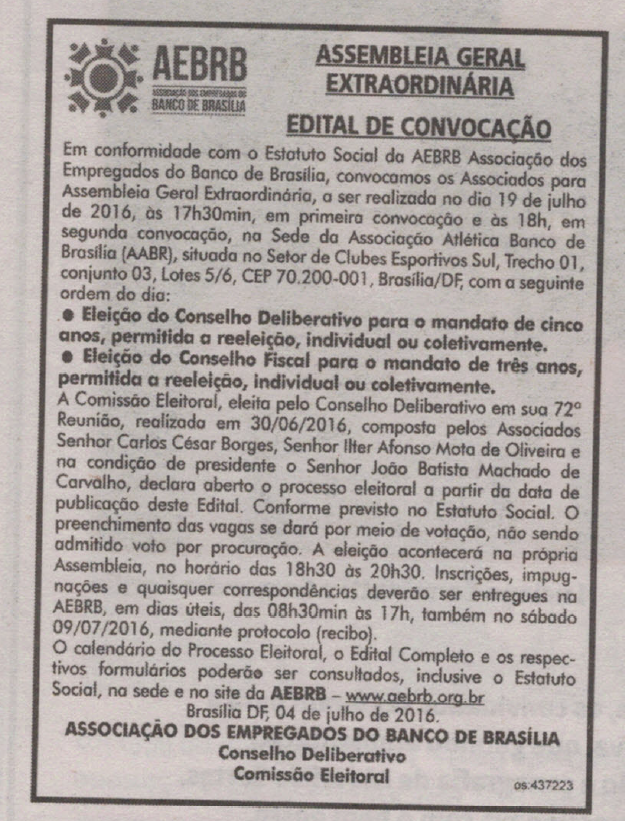 Ocorrerá em 19 de julho, na sede da Associação Atlética Banco de Brasília (AABR), a assembleia para eleição dos novos conselhos deliberativos e fiscal da Associação dos Empregados do BRB (AEBRB), conforme determina seu estatuto.