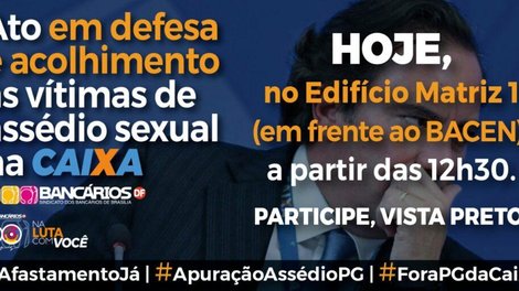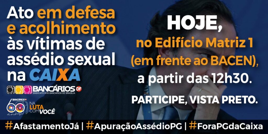 O Sindicato convoca as empregadas e empregados da Caixa para ato nesta quarta (29) em defesa e acolhimento das vítimas de assédio sexual na instituição, pelo imediato afastamento de Pedro Guimarães do cargo de presidente e pela rigorosa e imediata apuração das denúncias, inclusive nos campos criminal, civil e administrativo. Será às 12h30, no Matriz 1 da Caixa. O Sindicato pede que os bancários vistam preto.