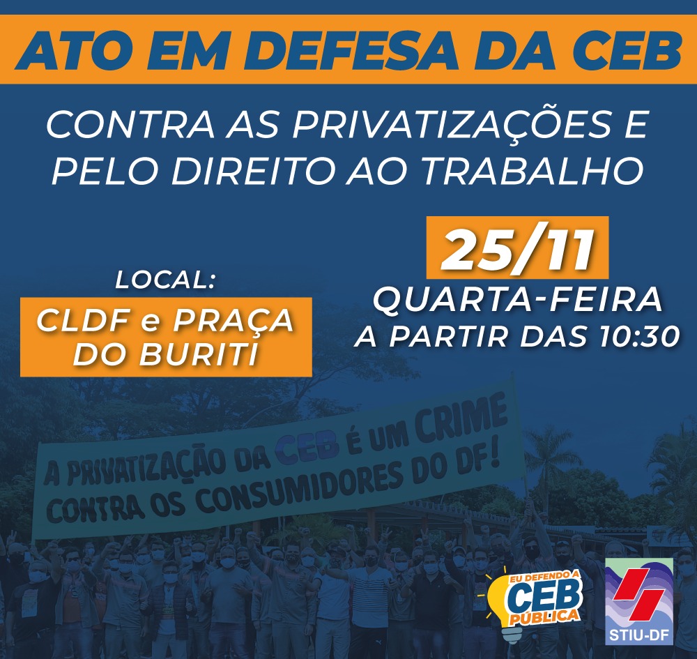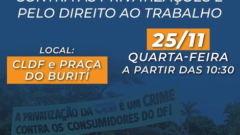Os trabalhadores da Companhia Energética de Brasília (CEB), movimentos populares e parlamentares realizam ato contra a privatização da concessionária de energia, na quarta-feira (25/11), às 10h, em frente à Câmara Legislativa do Distrito Federal (CLDF). A iniciativa tem como objetivo pressionar o GDF e destravar o diálogo entre o governador Ibaneis Rocha e o Sindicato dos Urbanitários no DF (STIU-DF).