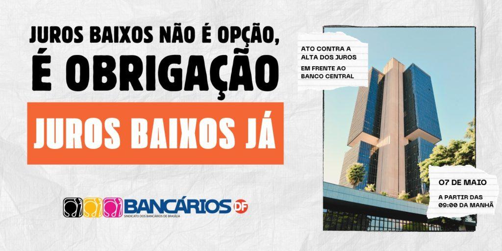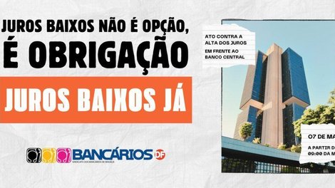 O Sindicato convida toda a categoria e a classe trabalhadora para um grande ato público nesta quarta-feira (07/05), às 09h, em frente ao Banco Central, em Brasília. A mobilização exige o fim dos juros altos que sufocam o povo, travam a economia e favorecem apenas os banqueiros.