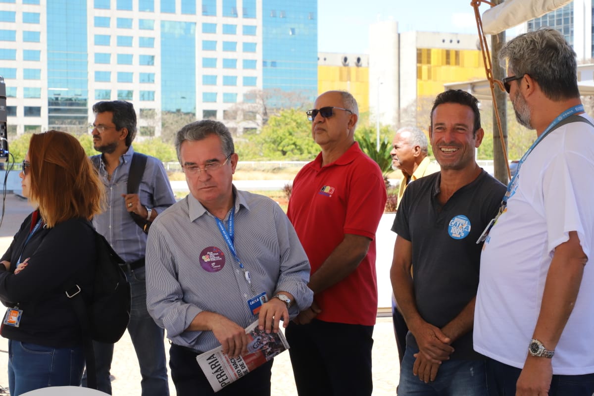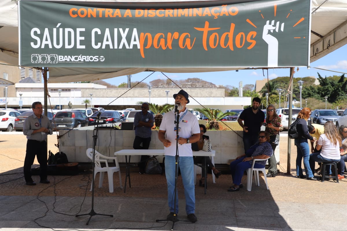 Em  ato em frente ao prédio Matriz I da Caixa, nesta sexta-feira (16),  dirigentes do Sindicato e de entidades associativas denunciaram a  resolução 23 da Comissão Interministerial de Governança Corporativa e de  Administração de Participações Societárias  da União (CGPAR) como ameaça ao futuro do Saúde Caixa por reduzir a  participação da empresa no financiamento da assistência e excluir novos  empregados do plano.