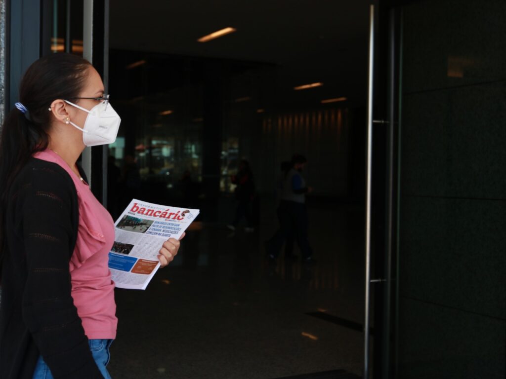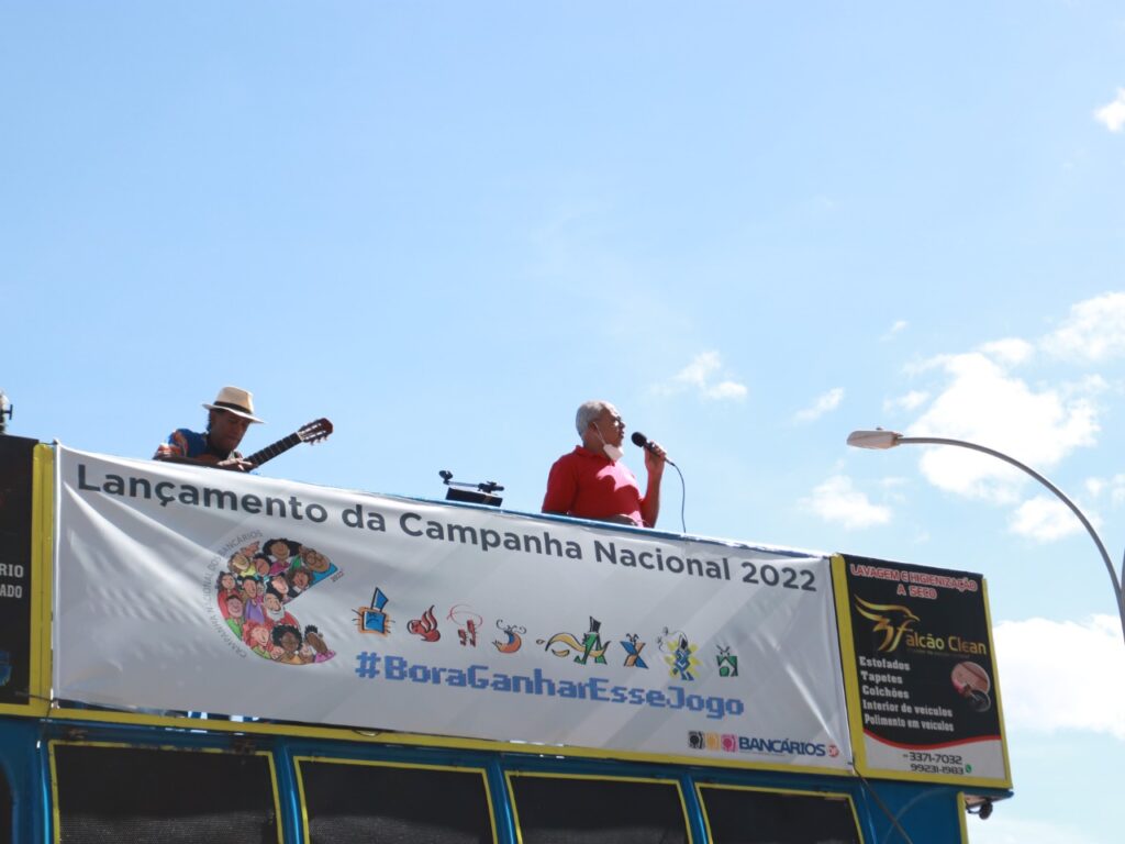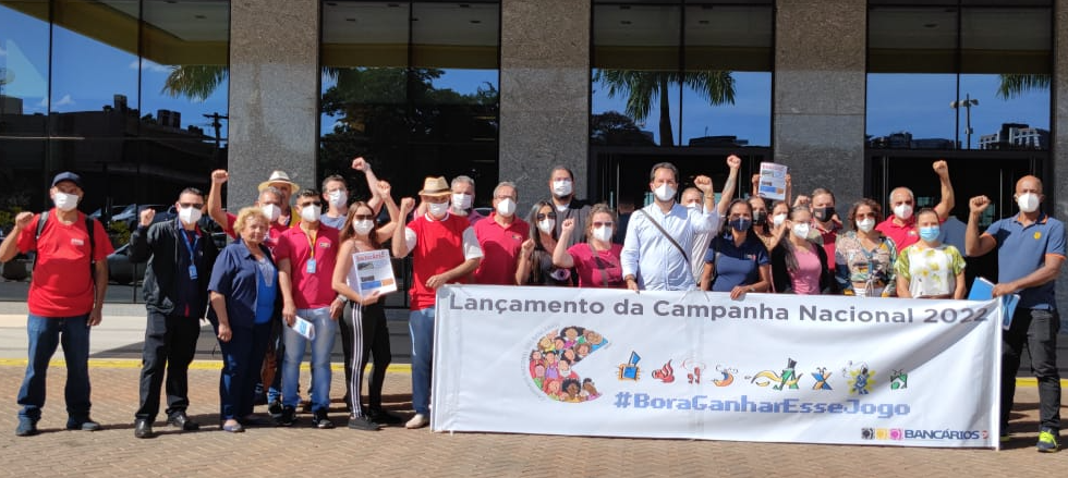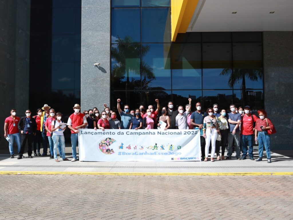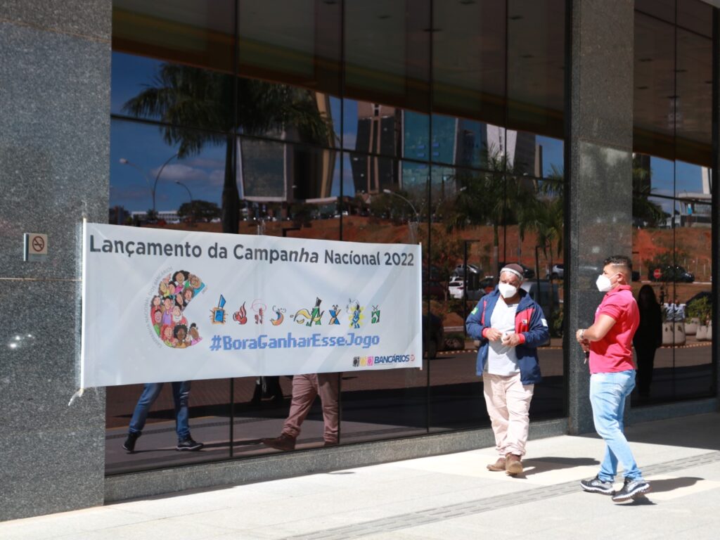 O Sindicato promoveu nesta quinta-feira (23), no Edifício Banco do Brasil da 201 Norte, ato de lançamento da Campanha Nacional dos Bancários 2022 no Distrito Federal e Entorno, para convocação da categoria à mobilização e à participação no processo de renovação da Convenção Coletiva de Trabalho (CCT) e dos acordos coletivos específicos por bancos.