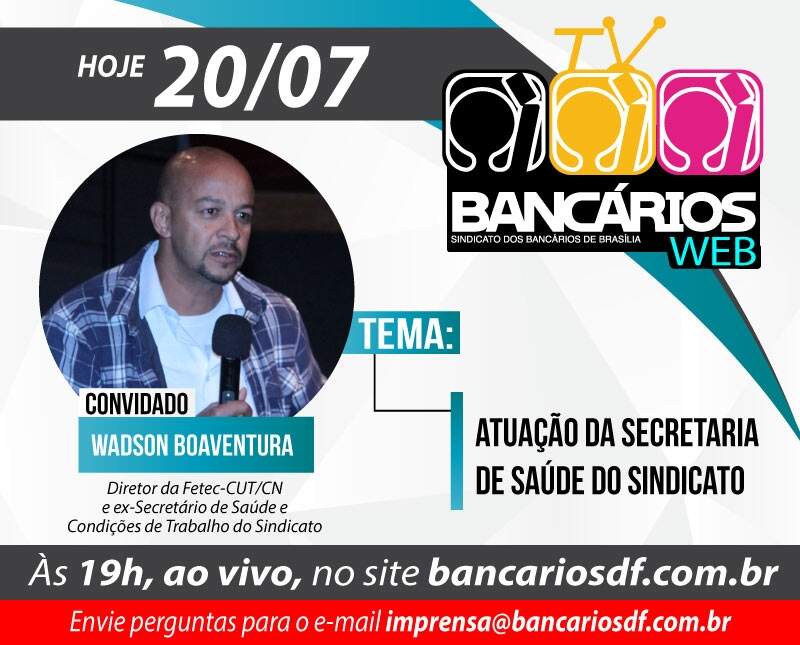 Participe! Envie suas dúvidas para o e-mail tvbancarios@bancariosdf.com.br. O programa será transmitido ao vivo a partir de 19h pelo portal do Sindicato e pelas redes sociais da entidade.