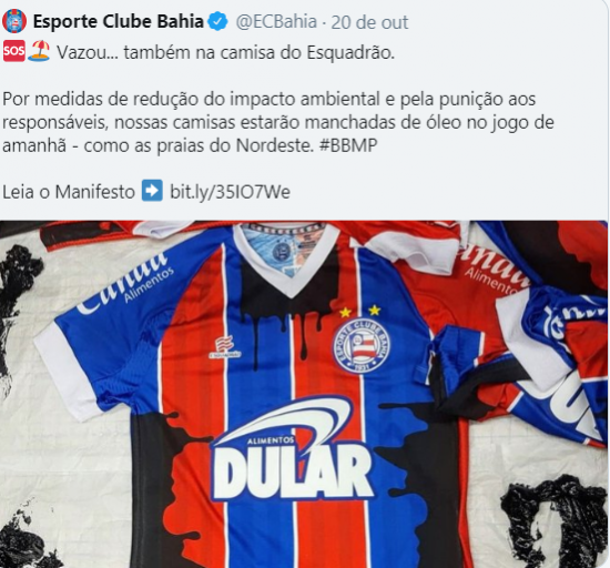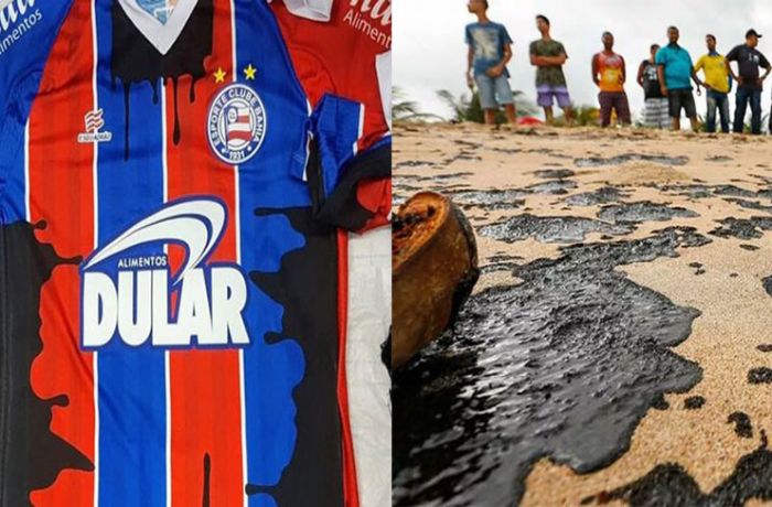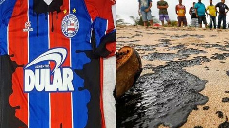 Em protesto contra a inépcia do governo de Jair de Bolsonaro (PSL), que há quase dois meses nada fez para resolver o problema, os jogadores do Bahia entram em campo nesta segunda-feira (21) para enfrentar o Ceará, em Pituaçu (BA), com uma camiseta reproduzindo as manchas de óleo que tomam conta das praias de litoral do Nordeste.