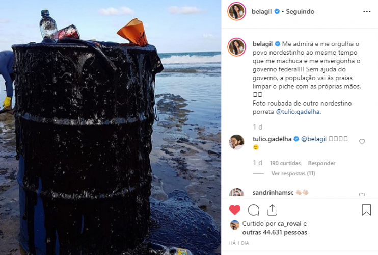 Bela Gil, que é baiana, elogia o Nordeste pela reação. “Me admira e me orgulha o povo nordestino, ao mesmo tempo que me machuca e me envergonha o governo federal!!! Sem ajuda do governo, a população vai às praias limpar o piche com as próprias mãos” postou.