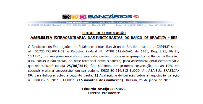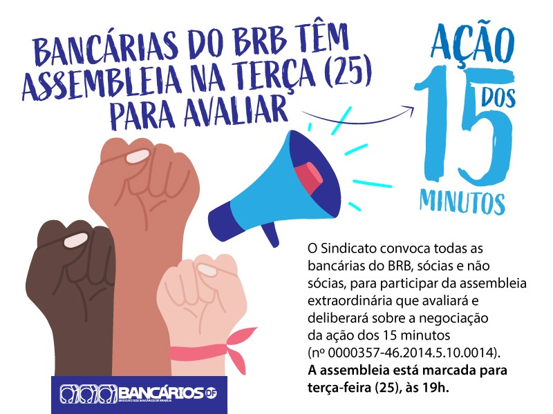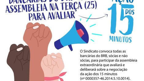 O Sindicato convoca todas as bancárias do BRB, sócias e não sócias, para participar da assembleia extraordinária que avaliará e deliberará sobre a negociação da ação dos 15 minutos (nº 0000357-46.2014.5.10.0014). A assembleia está marcada para terça-feira (25), às 19h, na sede do Sindicato.
