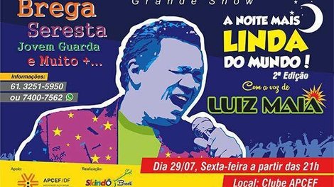 O show A noite mais linda do mundo, com voz do bancário Luiz Maia, é atração nesta sexta-feira (29), a partir das 21h, na Associação de Pessoal da Caixa Econômica Federal (Apcef/DF), localizada no Setor de Clubes Norte – Trecho 03.