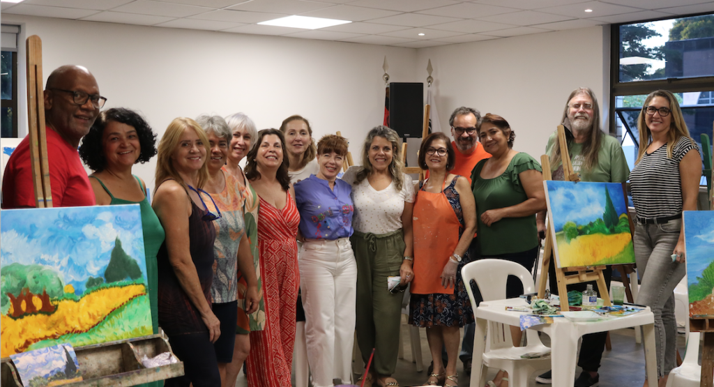 Com pincéis e tintas na mão e uma tela no cavalete, os aposentados participantes da oficina colocaram a mão na massa durante cinco horas e se divertiram a valer ao reproduzir a pintura de Van Gogh.