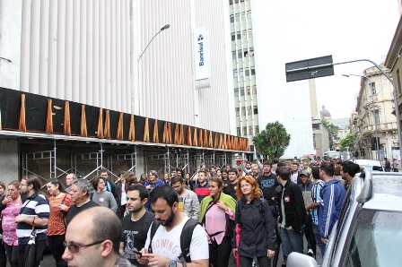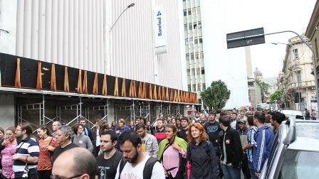 Depois da assembleia realizada no Clube do Comércio, em Porto Alegre, os bancários promoveram um protesto em frente ao prédio da Direção Geral (DG), na rua Caldas Junior, no centro da capital gaúcha. Nova mobilização foi marcada para a próxima segunda-feira (20).