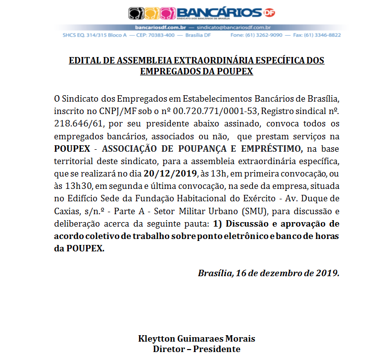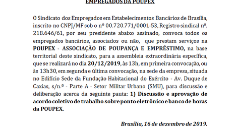 Confira a seguir o edital de convocação de assembleia dos bancários da Poupex:
