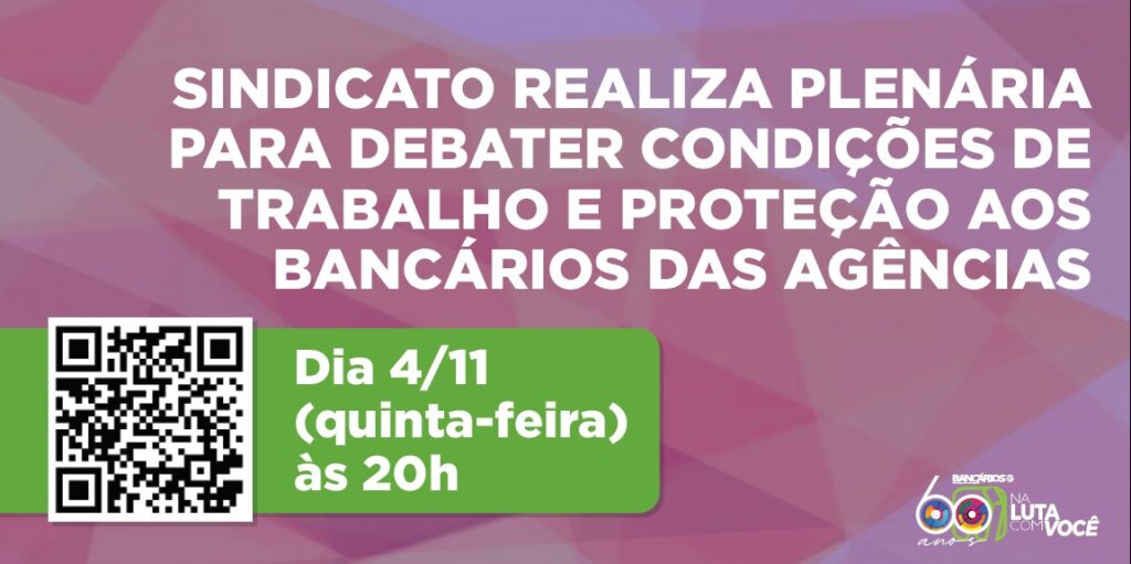 Com o objetivo de mapear e monitorar as condições de trabalho dos bancários e bancárias que trabalham em agências, o Sindicato promove na primeira quinta-feira de novembro uma plenária virtual. O encontro, marcado para 4 de novembro, a partir das 20h, vai abranger questões ligadas ao dia a dia nos locais de trabalho.