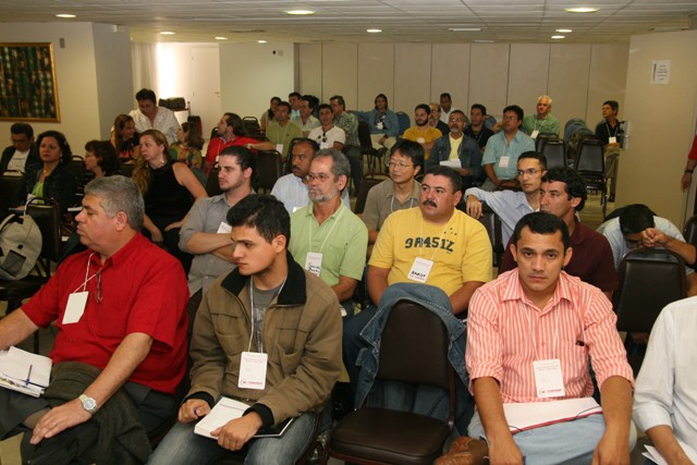 Bancários da Caixa Econômica Federal reunidos na Plenária Nacional que discutiu a nova tabela de unificação do PCS. Na 2ª fileira, os diretores do Sindicato Wandeir Severo (braços cruzados) e Alexandre Severo (camisa vinho)