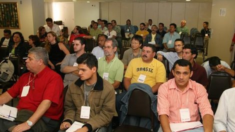 Bancários da Caixa Econômica Federal reunidos na Plenária Nacional que discutiu a nova tabela de unificação do PCS. Na 2ª fileira, os diretores do Sindicato Wandeir Severo (braços cruzados) e Alexandre Severo (camisa vinho)