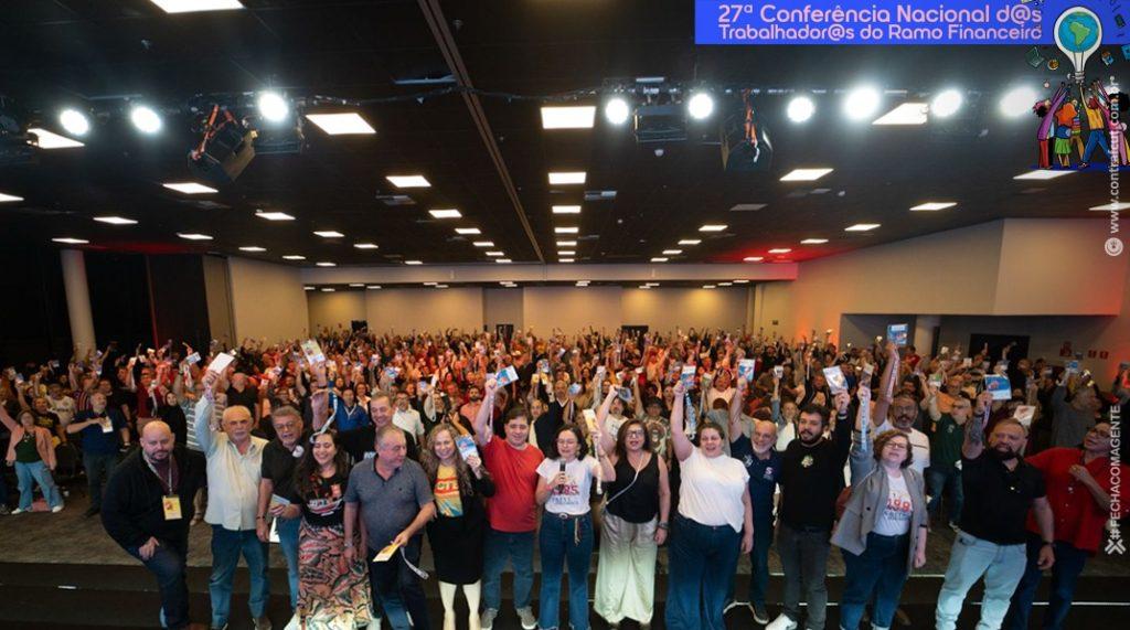 Após dois dias de debates, a 27ª Conferência Nacional dos Bancários aprovou neste domingo 24 de agosto em São Paulo o plano de lutas da categoria para o próximo período que inclui desde questões corporativas como mais saúde e melhores condições de trabalho e combate às metas abusivas e ao assédio moral, defesa do emprego e fim da terceirização, até temas urgentes da conjuntura política e econômica, como a defesa enfática da democracia, da soberania nacional e dos bancos públicos, hoje sob ataques do governo Trump com apoio da família Bolsonaro e seus seguidores, o que configura um crime de traição à pátria que precisa ser punido.