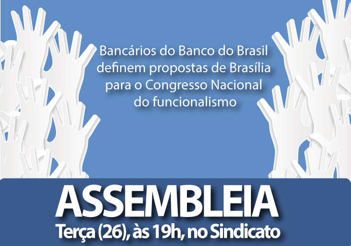 O Sindicato realiza na próxima terça-feira (26) assembleia específica dos bancários do Banco do Brasil que vai eleger os delegados e definir as propostas específicas de Brasília para o 26º Congresso Nacional dos Funcionários.