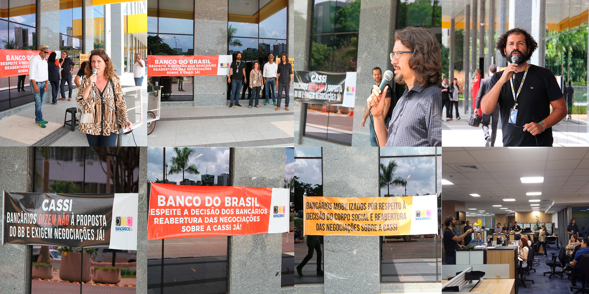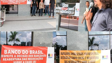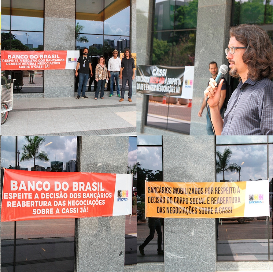 Bancários do Banco do Brasil realizaram nesta quinta-feira (18) um Dia Nacional de Luta em Defesa da Cassi e contra os descomissionamentos que estão ocorrendo no banco. Com faixas e entrega de material específico sobre a Caixa de Assistência, o Sindicato protestou em Brasília em frente à sede do banco, no Setor de Autarquias Norte, além de promover reuniões nos locais de trabalho.