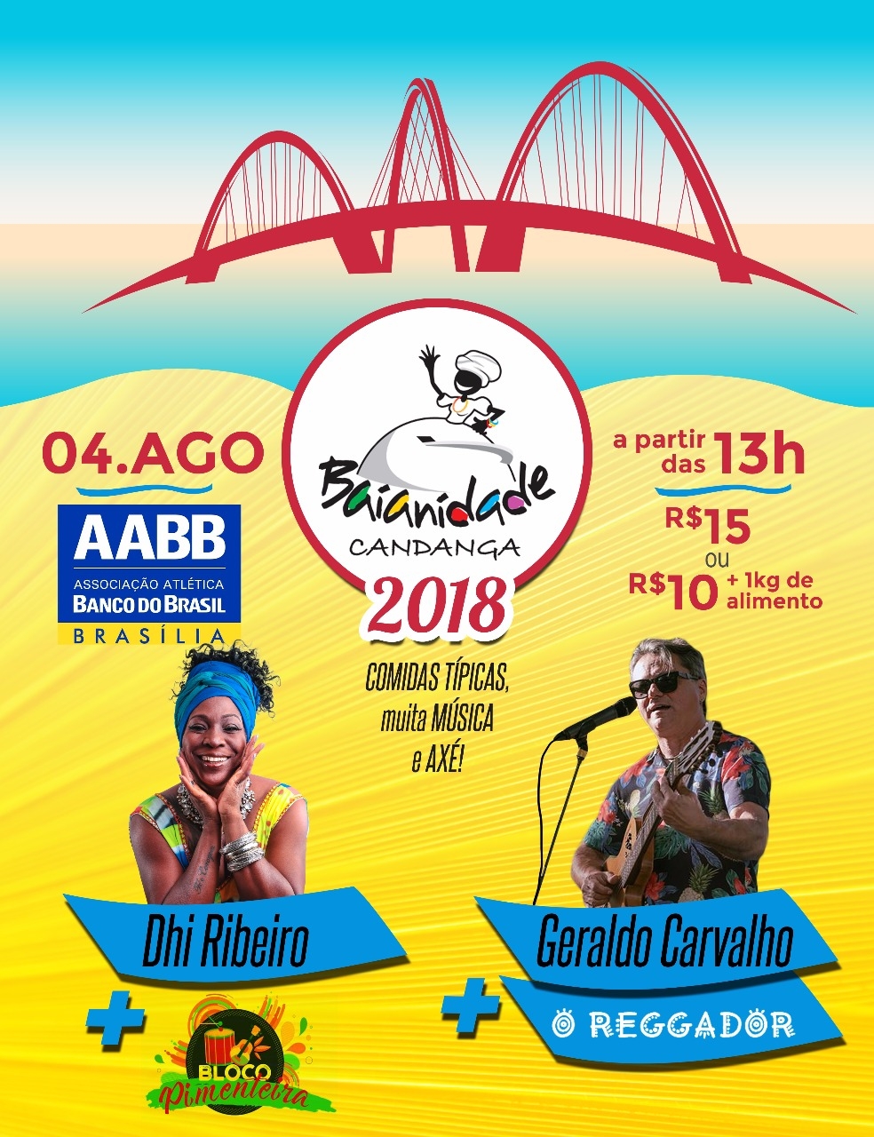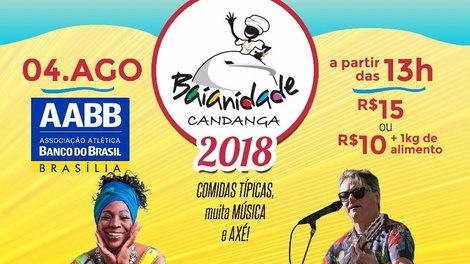 A 18ª edição da Baianidade Candanga, único evento verdadeiramente baiano do DF, organizado por funcionários do Banco do Brasil, será realizada neste sábado (4), a partir das 13h, no espaço do bangalô da Associação Atlética Banco do Brasil (AABB). As atrações são Dhi Ribeiro, Bloco Pimenteira e Geraldo Carvalho e O Reggador.
