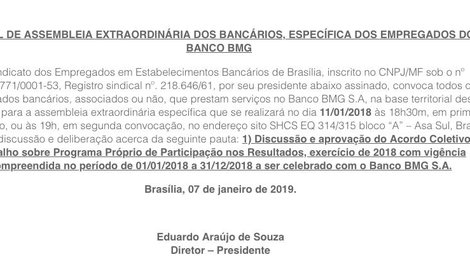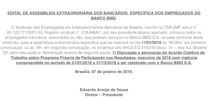 O Sindicato dos Empregados em Estabelecimentos Bancários de Brasília, inscrito no CNPJ/MF sob o nº 00.720.771/0001-53, Registro sindical nº. 218.646/61, por seu presidente abaixo assinado, convoca todos os empregados bancários, associados ou não, que prestam serviços no Banco BMG S.A, na base territorial deste sindicato, para a assembleia extraordinária específica que se realizará no dia 11/01/2018 às 18h30m, em primeira convocação, ou às 19h, em segunda convocação, no endereço sito SHCS EQ 314/315 bloco “A” – Asa Sul, Brasília-DF, para discussão e deliberação acerca da seguinte pauta: 1) Discussão e aprovação do Acordo Coletivo de Trabalho sobre Programa Próprio de Participação nos Resultados, exercício de 2018 com vigência compreendida no período de 01/01/2018 a 31/12/2018 a ser celebrado com o Banco BMG S.A.