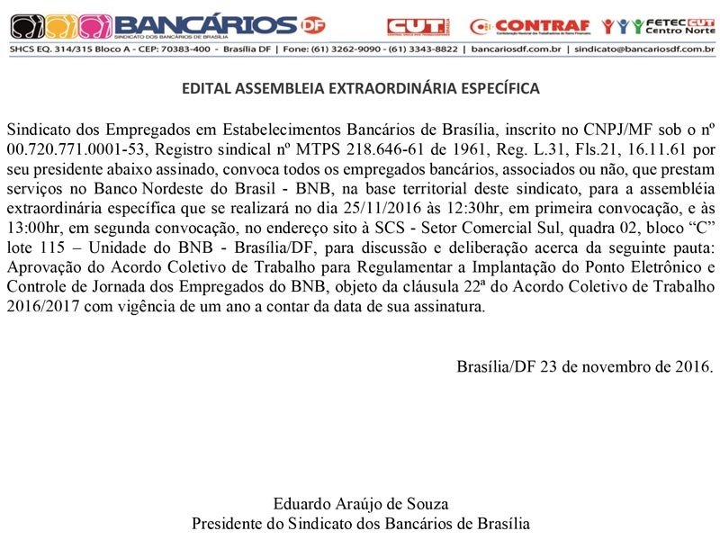 O Sindicato convoca os bancários, associados ou não, do Banco do Nordeste do Brasil (BNB) para assembleia extraordinária específica, nesta sexta-feira (25). A primeira convocação será às 12h30 e a segunda, às 13h. A reunião acontecerá na unidade do BNB localizada no Setor Comercial Sul (SCS, Quadra 2, Bloco C, lote 115).