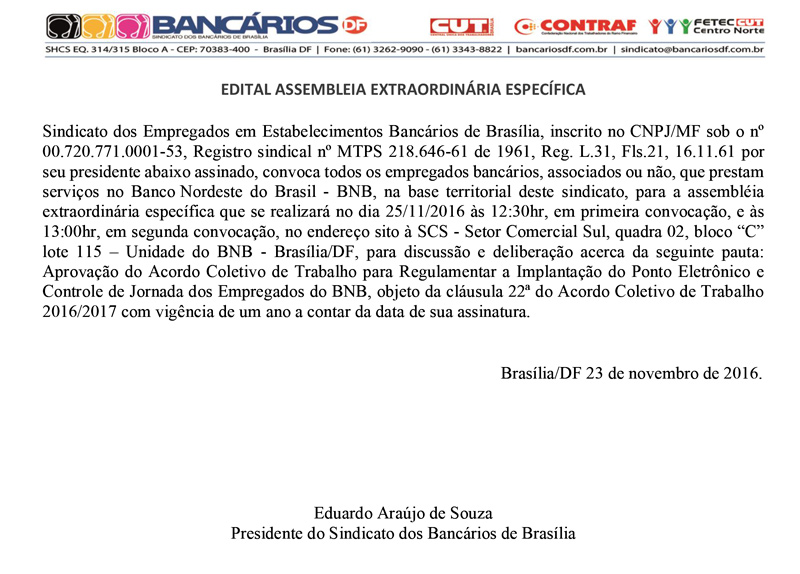 Na pauta, discussão e deliberação acerca do Acordo Coletivo de Trabalho para regulamentar a implantação do ponto eletrônico e controle da jornada dos empregados do BNB. O assunto consta da cláusula 22ª do Acordo Coletivo de Trabalho 2016/2017, com vigência de um ano a contar da data de sua assinatura.