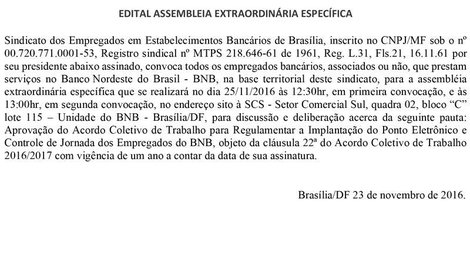 O Sindicato convoca os bancários, associados ou não, do Banco do Nordeste do Brasil (BNB) para assembleia extraordinária específica, nesta sexta-feira (25). A primeira convocação será às 12h30 e a segunda, às 13h. A reunião acontecerá na unidade do BNB localizada no Setor Comercial Sul (SCS, Quadra 2, Bloco C, lote 115).