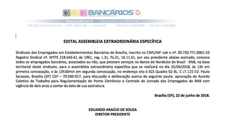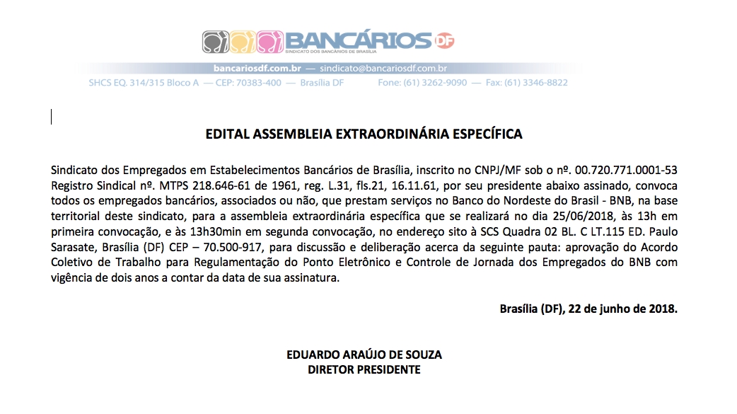 Sindicato dos Empregados em Estabelecimentos Bancários de Brasília, inscrito no CNPJ/MF sob o nº. 00.720.771.0001-53 Registro Sindical nº. MTPS 218.646-61 de 1961, reg. L.31, fls.21, 16.11.61, por seu presidente abaixo assinado, convoca todos os empregados bancários, associados ou não, que prestam serviços no Banco do Nordeste do Brasil - BNB, na base territorial deste sindicato, para a assembleia extraordinária específica que se realizará no dia 25/06/2018, às 13h em primeira convocação, e às 13h30min em segunda convocação, no endereço sito à SCS Quadra 02 BL. C LT.115 ED. Paulo Sarasate, Brasília (DF) CEP – 70.500-917, para discussão e deliberação acerca da seguinte pauta: aprovação do Acordo Coletivo de Trabalho para Regulamentação do Ponto Eletrônico e Controle de Jornada dos Empregados do BNB com vigência de dois anos a contar da data de sua assinatura.