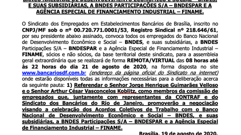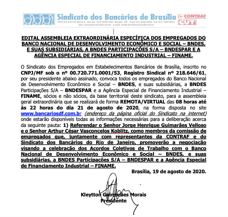 Confira o edital de convocação da assembleia remota dos bancários do BNDES marcada para esta sexta-feira (21):