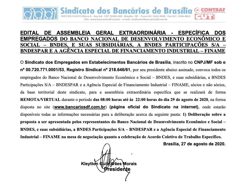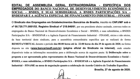 O Sindicato convoca os bancários do sistema BNDES para assembleia remota que será realizada neste sábado (29) parar deliberar acerca da proposta a ser apresentada pelo banco. O horário para votação será de 8h às 22h.