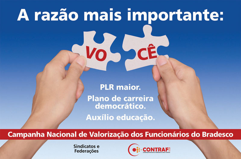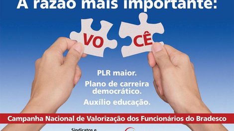 O Bradesco tem investido muito em marketing, mas quase nada em seus empregados. Temos uma extensa pauta de reivindicações que o banco insiste em não avançar. Estamos às vésperas de mais uma campanha salarial e temos antigas demandas que ainda não foram solucionadas pelo Bradesco. Os bancários do grupo devem participar em massa das atividades que os sindicatos estão organizando e vamos aquecer as turbinas, porque temos muito pelo que lutar nesta campanha, afirma Vagner Freitas, presidente da Confederação Nacional dos Trabalhadores do Ramo Financeiro (Contraf-CUT) e funcionário do Bradesco.