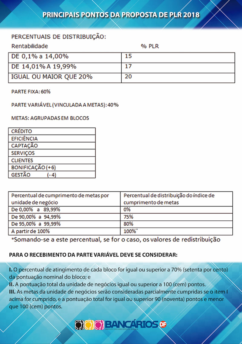 A proposta do BRB, apresentada em negociação no dia 10 passado, prevê a distribuição de 60% de forma linear e 40% vinculados a metas. O pagamento vinculado a metas será feito às unidades que atingirem a partir de 90% de cumprimento. As metas serão agrupadas em blocos, e a apuração será pelos produtos que compõem esse bloco (veja quadro).