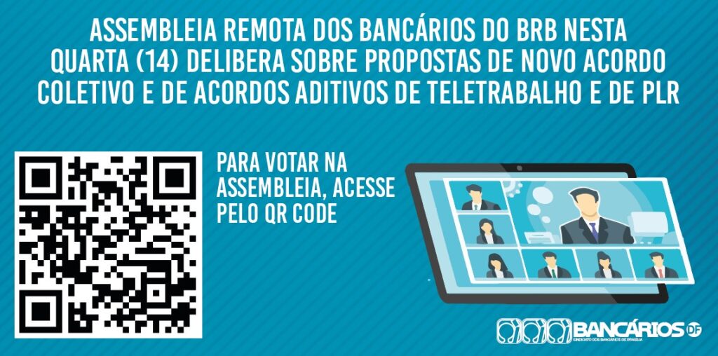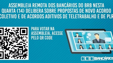 O Sindicato convoca os bancários e bancárias do BRB para participarem de assembleia geral extraordinária específica remota nesta quarta-feira (14), para deliberação acerca dos termos das propostas de Acordo Coletivo de Trabalho (ACT) para 2022/2024, de Acordo Aditivo de PLR para 2022/2023 e de Acordo Aditivo de Teletrabalho para 2022/2023 (confira a íntegra na sequência mais abaixo, nesta ordem). O Sindicato indica a aprovação dos acordos.