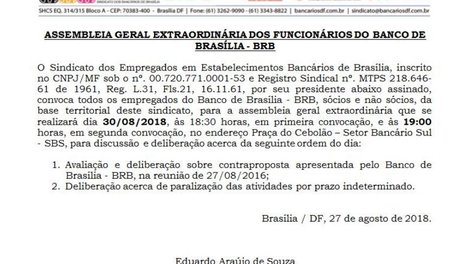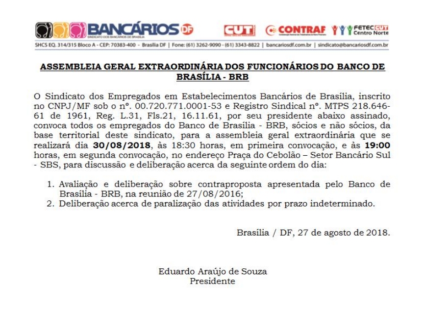 O Sindicato dos Empregados em Estabelecimentos Bancários de Brasília, inscrito no CNPJ/MF sob o nº. 00.720.771.0001-53 e Registro Sindical nº. MTPS 218.646-61 de 1961, Reg. L.31, Fls.21, 16.11.61, por seu presidente abaixo assinado, convoca todos os empregados do Banco de Brasília - BRB, sócios e não sócios, da base territorial deste sindicato, para a assembleia geral extraordinária que se realizará dia 30/08/2018, às 18:30 horas, em primeira convocação, e às 19:00 horas, em segunda convocação, no endereço Praça do Cebolão – Setor Bancário Sul - SBS, para discussão e deliberação acerca da seguinte ordem do dia: