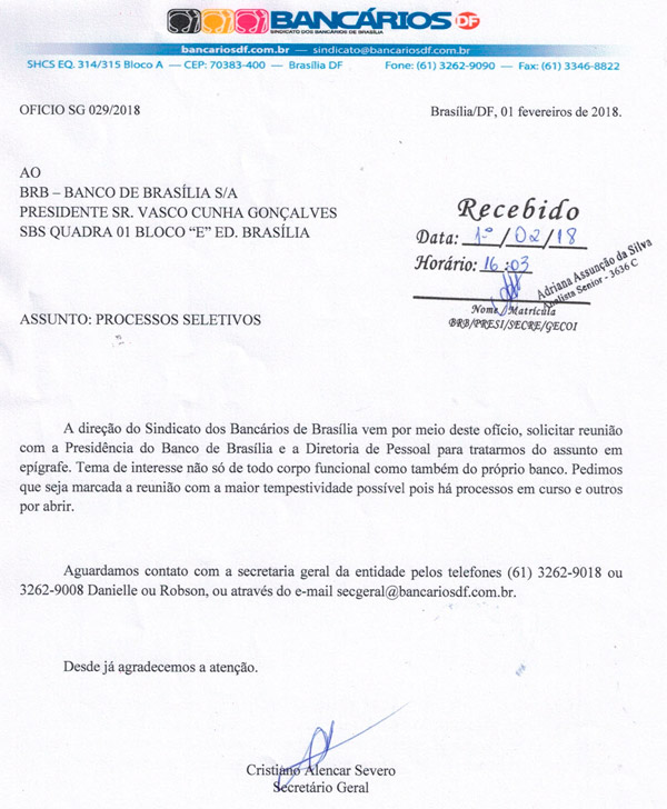 Mediante todo esse panorama, o Sindicato solicita que a área de pessoas e a presidência do banco avaliem como tem sido o encaminhamento dos processos seletivos no BRB e deem publicidade e transparência cada vez maiores às seleções. Por fim, a direção da entidade sindical entende que deve haver parâmetros definidos que não sejam flexibilizados por conveniência que não cabe a uma empresa pública do porte do Banco de Brasília.
