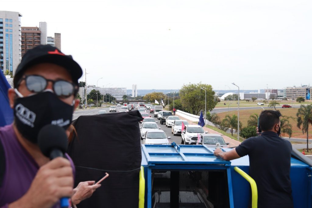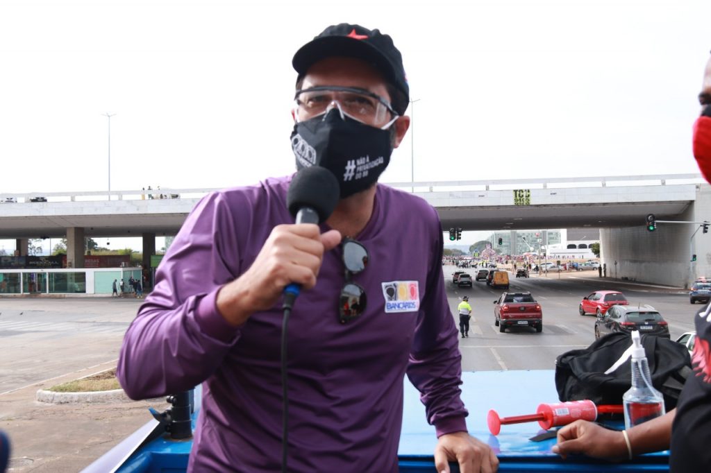 De cima do carro de som, o presidente do Sindicato coordenou o carro de som que conduziu pelo Eixo Monumental até a Rodoviária do Plano Piloto e com dirigentes do Sinpro-DF, ADUNB e outras entidades sindicais se revezaram para expor os motivos pelos quais os brasileiros querem o fim do governo Bolsonaro. Kleytton frisou que “a categoria bancária e o Brasil estão sendo atacados por esse desgoverno. Bolsonaro aproveita da pandemia para efetivar o saque do país e inviabilizar o Brasil. O processo de entrega de patrimônio, de abertura de capital, de venda e liquidação de ativos importantes do BB e da Caixa, por exemplo, são estratégias de destruição de Bolsonaro que não tem plano de governo, mas plano de negócio que pretende vender o país”.