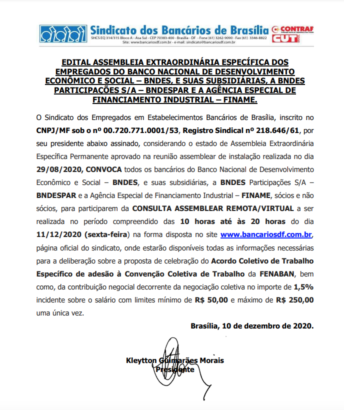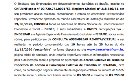 Considerando o estado de assembleia extraordinária específica permanente aprovado na reunião assemblear de instalação realizada no dia 29 de agosto, o Sindicato convoca os bancários e bancárias do BNDES e suas subsidiárias para participarem da consulta assemblear remota nesta sexta-feira (11) para deliberar acerca da proposta de celebração do Acordo Coletivo de Trabalho específico de adesão à Convenção Coletiva de Trabalho da Fenaban.