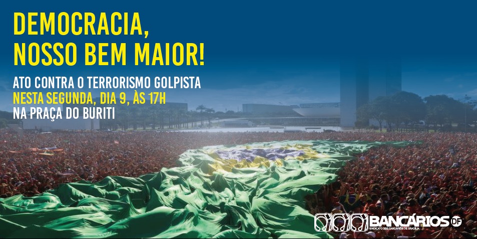 O Sindicato, em conjunto com representações dos demais trabalhadores, movimentos sociais, partidos políticos e instituições democráticas, reforça a convocação para o ato desta segunda-feira (9), às 17 h, na praça do Buriti, em defesa da democracia e contra os atos terroristas ocorridos e a postura omissa do governo Ibaneis.