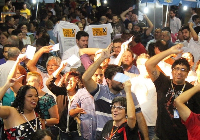 A assembleia geral dos bancários que rejeitou, na quinta-feira 1º, a proposta rebaixada da Fenaban e decidiu pela paralisação por tempo indeterminado em todos os bancos a partir do dia 6 também foi marcada por diversas manifestações políticas contra o agora presidente Michel Temer.