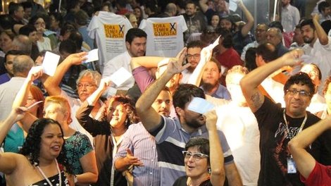 A assembleia geral dos bancários que rejeitou, na quinta-feira 1º, a proposta rebaixada da Fenaban e decidiu pela paralisação por tempo indeterminado em todos os bancos a partir do dia 6 também foi marcada por diversas manifestações políticas contra o agora presidente Michel Temer.