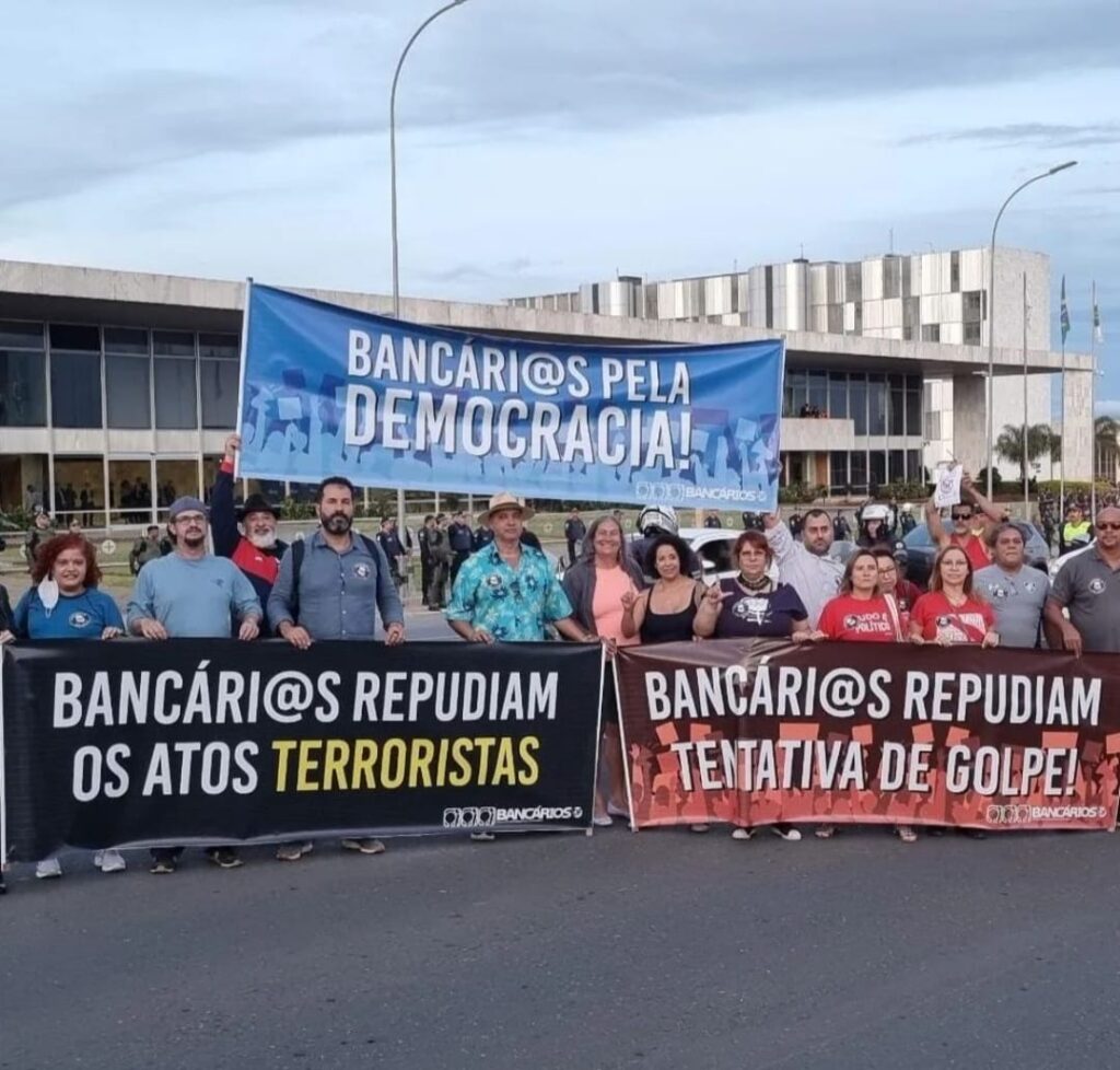 Ao lado de outras categorias organizadas, partidos políticos e movimentos sociais, bancários e bancárias do DF participaram nesta segunda-feira (9) do ato em defesa da democracia e em repúdio ao terrorismo. A mobilização na capital federal, palco das cenas de vandalismo do último domingo, se concentrou em frente ao Palácio do Buriti. Todas as unidades da federação também registraram manifestações pró-democracia e contra a tentativa de golpe de estado.